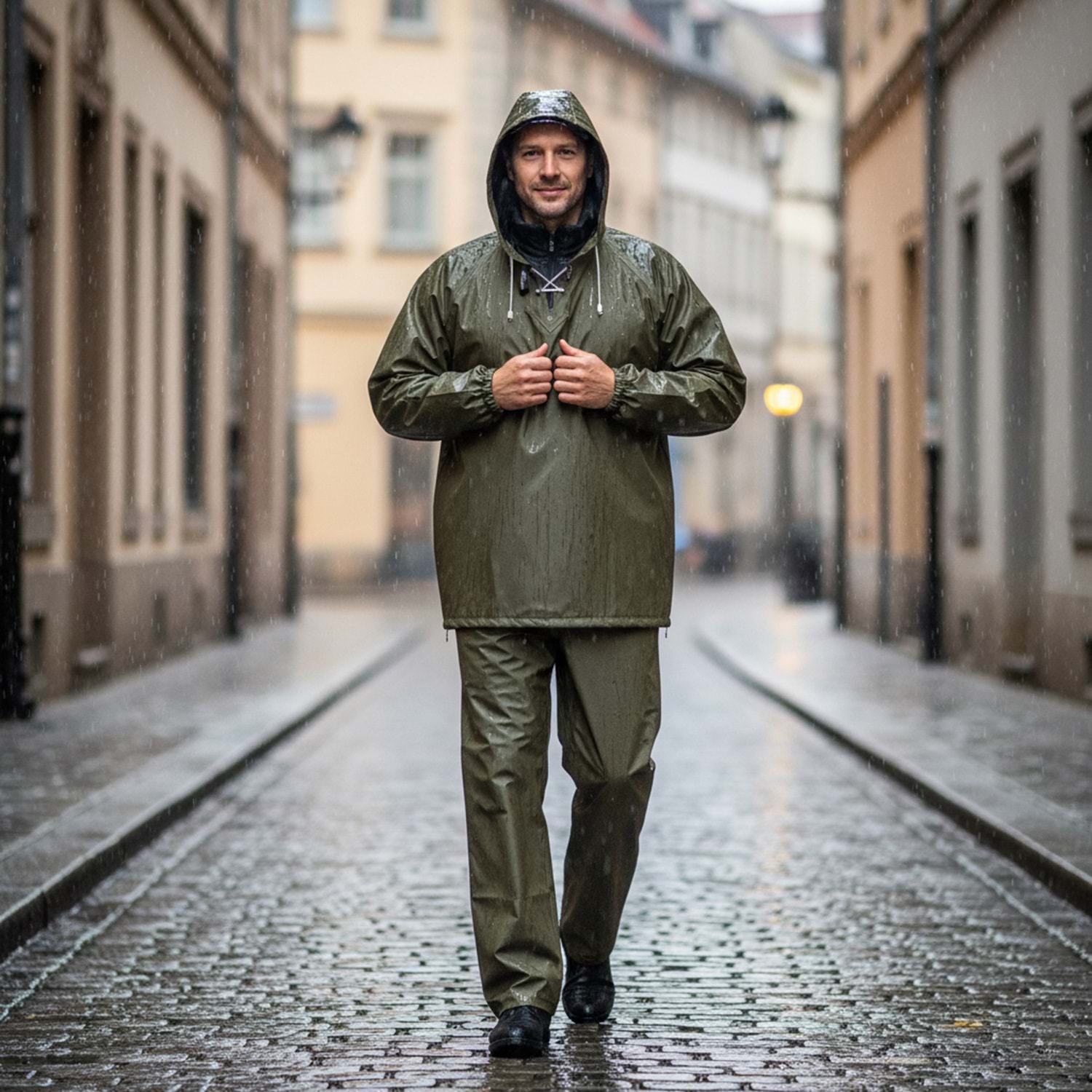 Pratik Tasarım: Kapüşonlu ceket ve lastikli pantolon bilekleri sayesinde tam koruma sağlar.